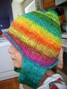 Yarn: Noro “Taiyo” Color #11–I had to use portions of two skeins in order to get the ear flaps to have the same color gradient.