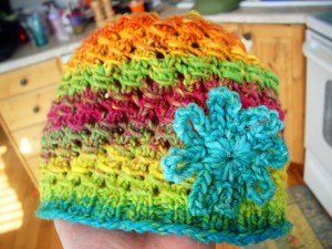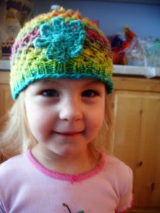 I think it’s just darling, even if the stitch is kind of annoying to work…knit loosely, very loosely! I’m definitely going to make some more of these; I think Rachel would be so adorable in a little yellow hat with an orange flower on the side. Perhaps I’ll make a wee little one as well in case Baby #4 turns out to be a girl; it’d be super cute on a newborn.