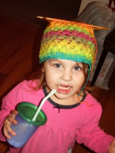 Of all my girls, Renaissance is definitely the most knitworthy. She genuinely wants me to knit things for her and is giddy whenever I present her with a new handmade item. When I gave her this hat, she yelled “Yay!” and started jumping up and down, then had to run to the mirror to see how it looked on her and then insisted on wearing it to bed because she believed it would give her “good rainbow dreams.” You better believe that I’ll keep knitting for someone who appreciates it as much as that!