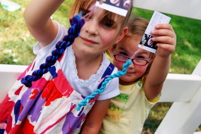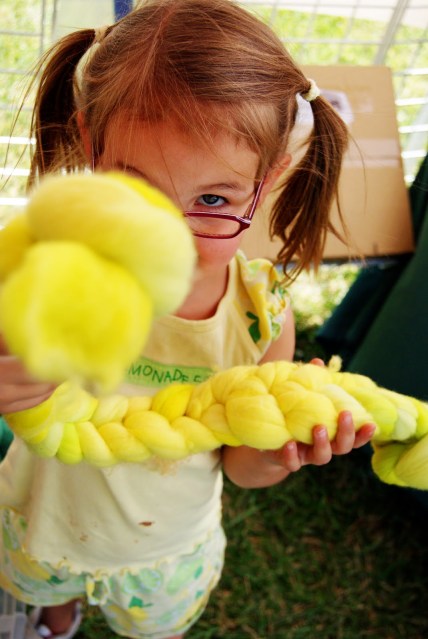Sample yarn from the festival. Bluebird named hers “Midnight” and Penguin named hers “Ocean.” It’s funny when they lose them around the house because you’ll hear a voice squeal, “Oh no! Ocean! Where’s my Ocean?!?!” Perhaps we can eek some doll hats out of the teeny skeins.