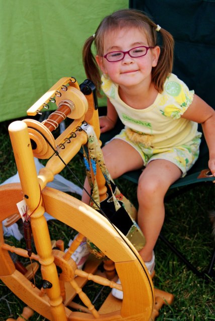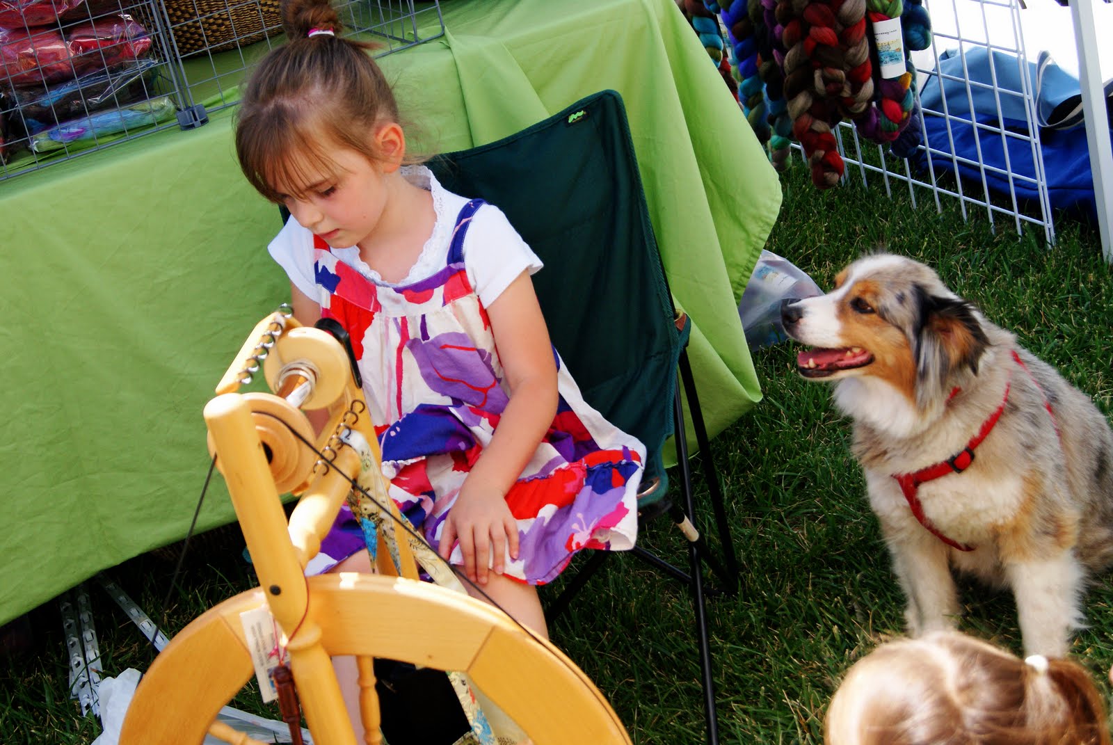 A lady at the festival was kind enough to allow Bluebird and Penguin to pedal on her spinning wheel. (Bluebird asked when she could have some fiber to actually spin.) I only have a drop spindle at home, which impedes my spinning speed. Someday I’d like to have a wheel, but I have to always decide between food, school supplies and hobbies. Responsibility can be such a downer sometimes.