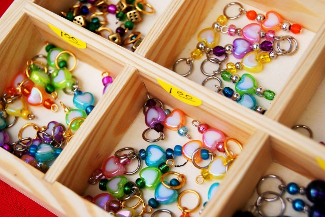 Stitch markers that Bluebird tried to talk me into buying for her. The lady manning the booth informed Bluebird that “stitch marker collections” were really fun. I informed Bluebird that stitch marker collections are even more fun when you actually use the stitch markers for knitting, and when I see her knitting on a regular basis that I will consider allowing her to start a stitch marker collection. I always get to be the bad guy. 😉