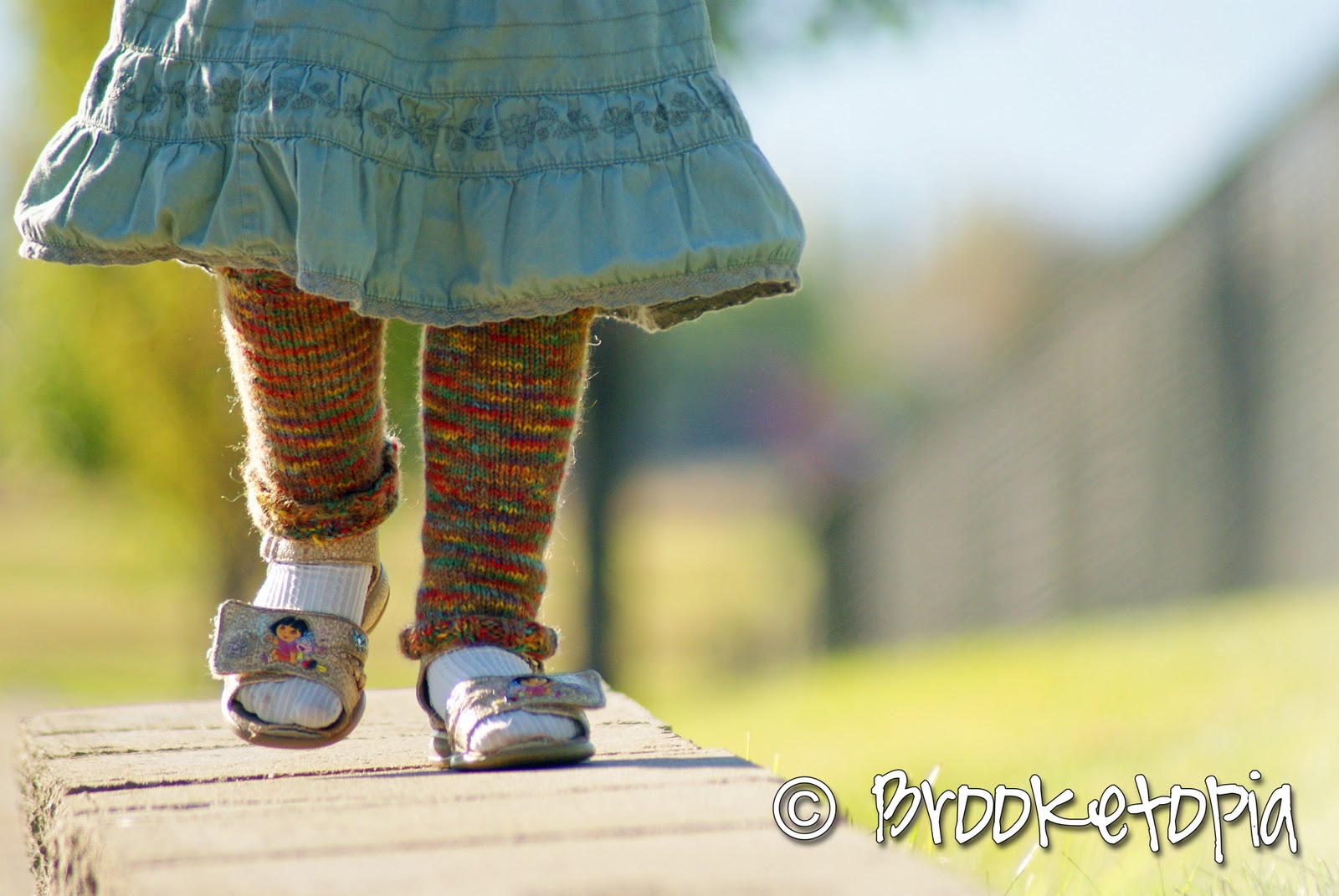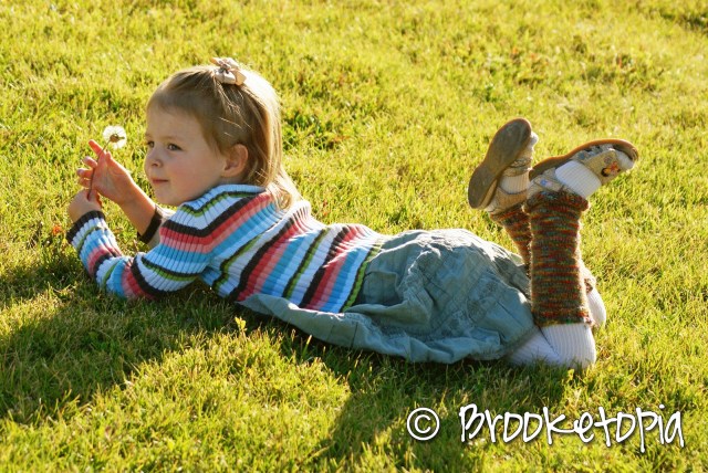 As soon as she learned that vital bit of information, she snatched the hanks right out of the box and clutched them close and declared that they were hers. Being a complete softie, I didn’t put up much of a fight. (I had actually ordered them because I thought the color would please her when she found out the name.)We searched and searched for a pattern befitting the magically-colored yarn, and finally happened upon this cute (free!) pattern for little leg warmers. Junebug gasped and her eyes lit up, and I knew we’d found this yarn’s calling.