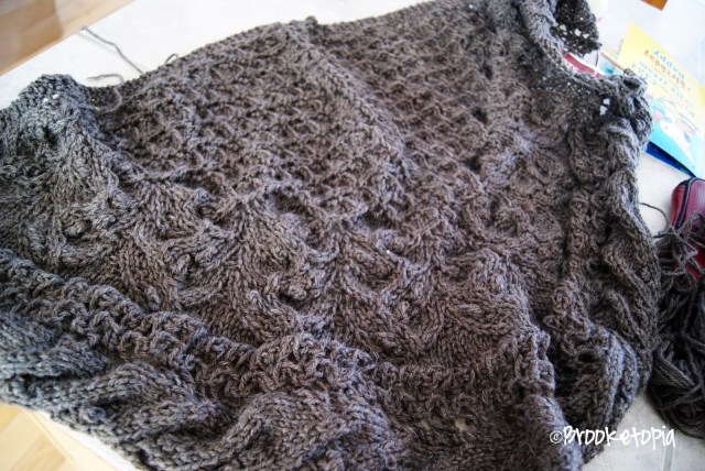 Most of the knitting has been accomplished on my back, on the couch, while I watch old episodes of Frasier. (Goodness, I loved that show while I was growing up!) Any time I pick this up, I start remembering Frasier funnies, which is entirely awesome to me.