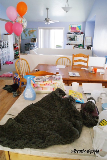 I started knitting with the fifth, and final, skein of yarn today. I have about six more repeats of the edging to go and then this will be ready for a soak and a block. My back has improved to allow for less couch-lounging and more standing, so my knitting has relocated to the kitchen counter. The counter is higher than any of the tables in the house, so it makes for a good surface to rest my knitting–I don’t have to stoop down to pick it up, and I don’t have to support the weight of the project while knitting because it rests on the counter.