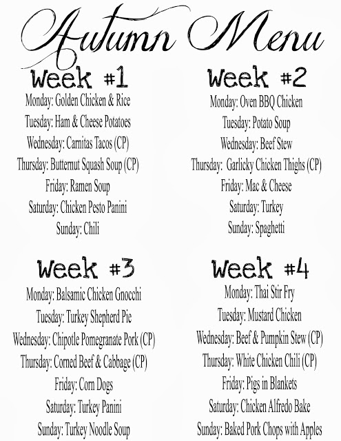 I’ve planned out four weeks’ worth of meals, and we’ll go through the rotation three times:  October, November, and December.  I’ll get good at making the same things over and over again, and I won’t have to sit down to plan out the next week anymore.  It’s just done.  Go shopping and cook.