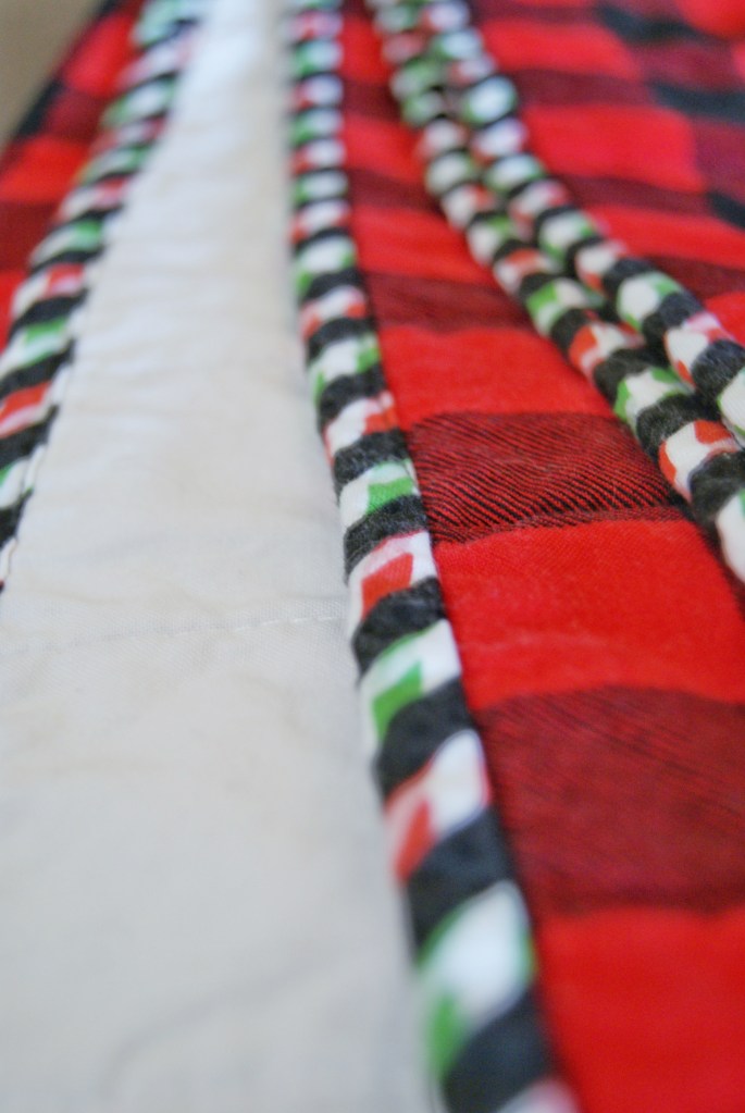 Quilting: Aurifil 40 wt in Natural White in the needle, and Aurifil 40 wt Red in the bobbin. I quilted straight vertical lines, 2.5″ apart. I now wish I’d done a little more, but I was nervous about quilting my first twin-size quilt and wanted to keep it super simple.