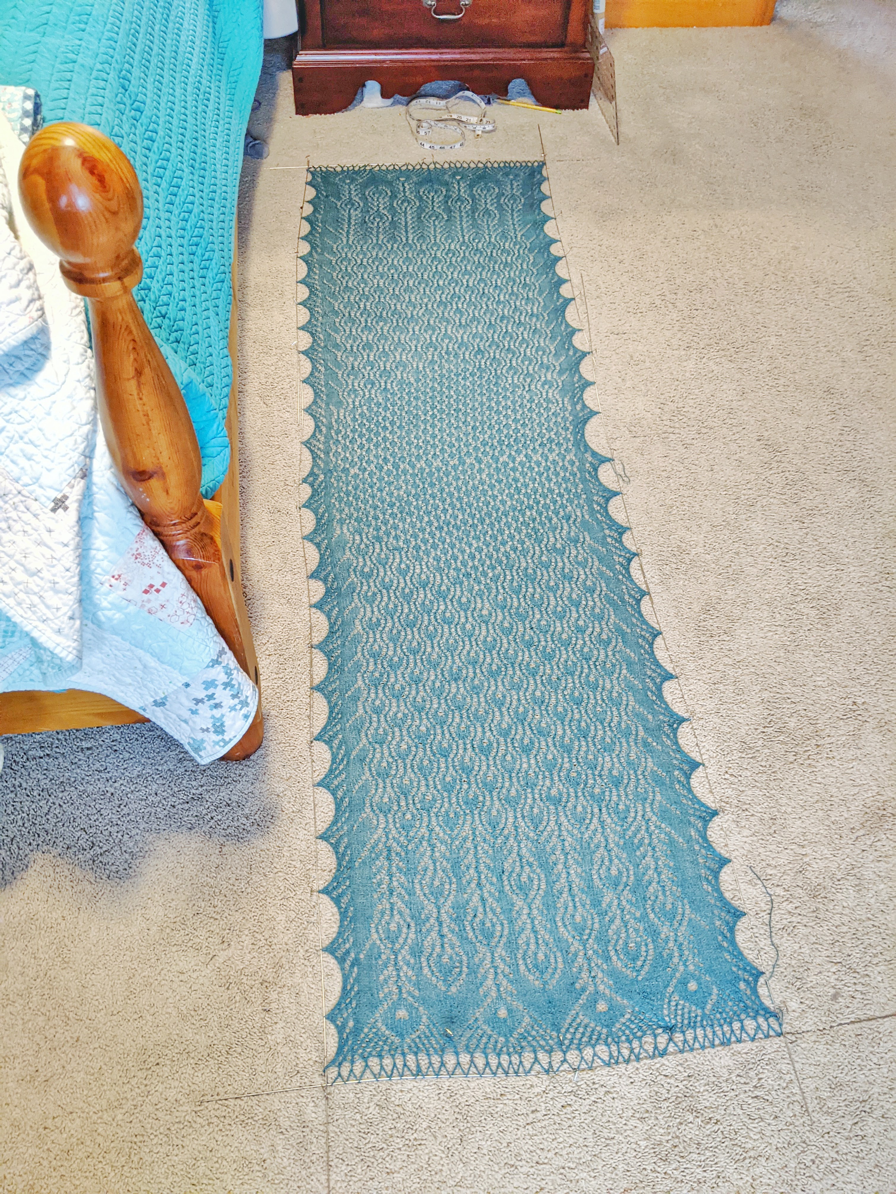 Pattern: Peacock Feathers Stole, by Dorothy Siemens, formerly of Fiddlesticks Knitting. It looks like she’s retired from knitting design, so the original website is gone and you have to purchase the pattern through Ravelry.