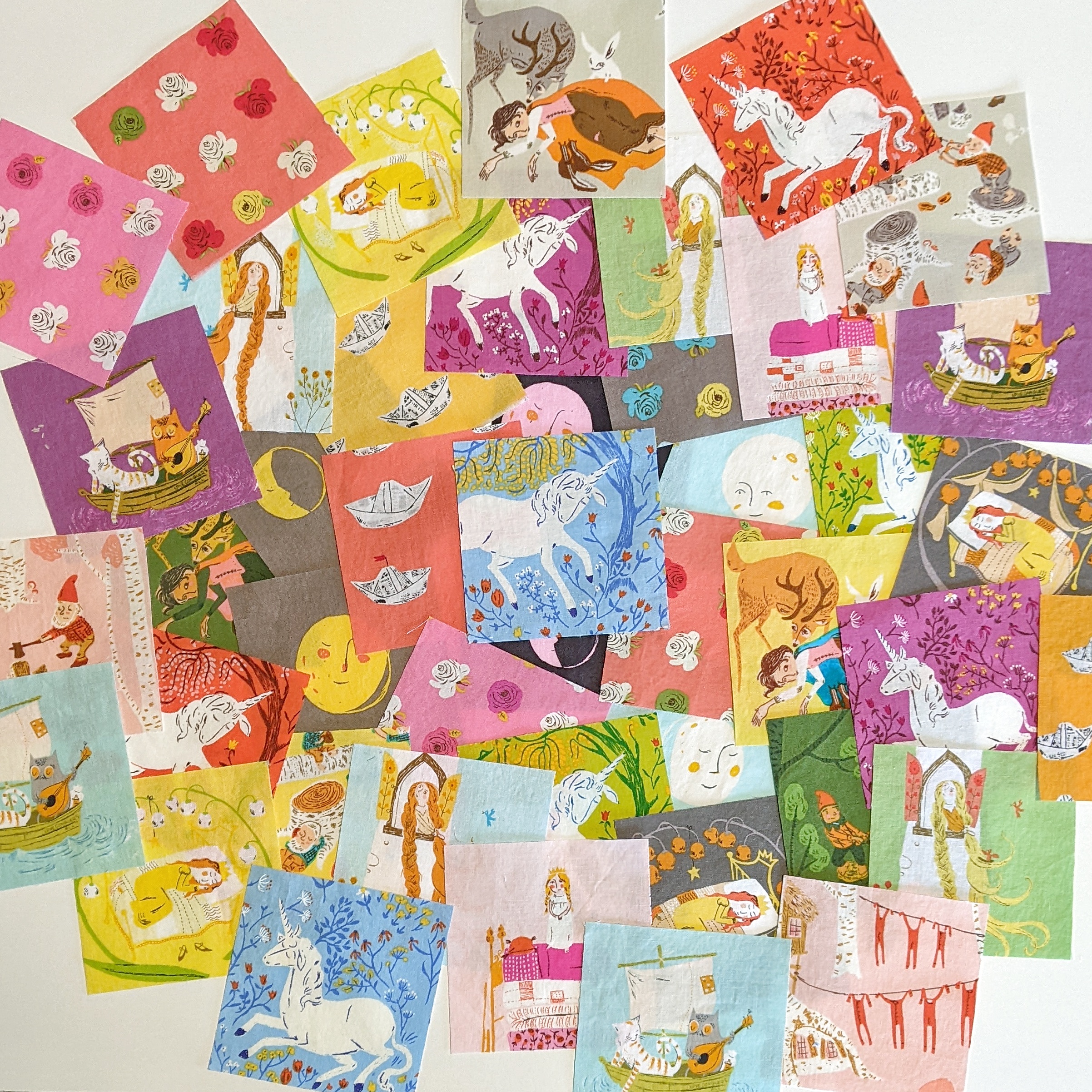 I’ve been collecting fat quarter bundles of each of Heather Ross’ Far Far Away fabric collections since…2015, I think. The first collection popped up in a Fat Quarter Shop flash sale and I made a noise not of this world when I saw it, and grabbed it up because I LOVED those unicorns. We all know how often we actually get to working with spur-of-the-moment purchases, so that fat quarter bundle was still sitting on the shelf when the second Far Far Away collection came out, and I decided that I’d buy that one as well and do a compilation project someday.