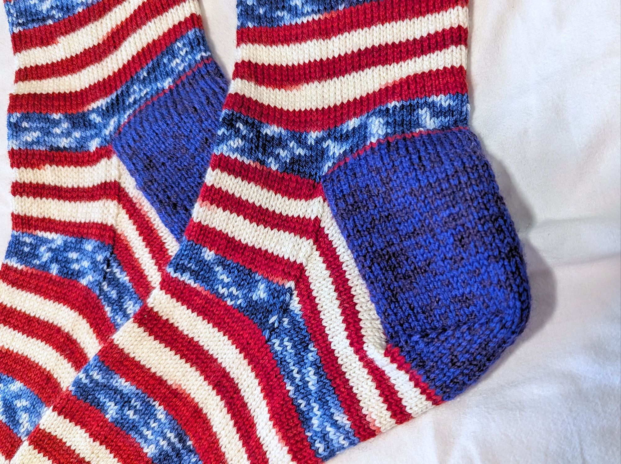We were discussing his growing collection of handknit socks last year after he opened his 2024 pair, and he mentioned that it would be really cool to have some striped USA socks, but it would probably be really difficult to start and stop with the red and white yarns and how that was too much to ask of me. I tucked that little quip away in my note-keeping app and when it came time to decide what to make him for this year’s socks, I decided to take a quick look on the internet to see if some self-striping Americana yarn already existed out there. I happened upon The Painted Tiger’s version and bought it as fast as I could. So exciting!