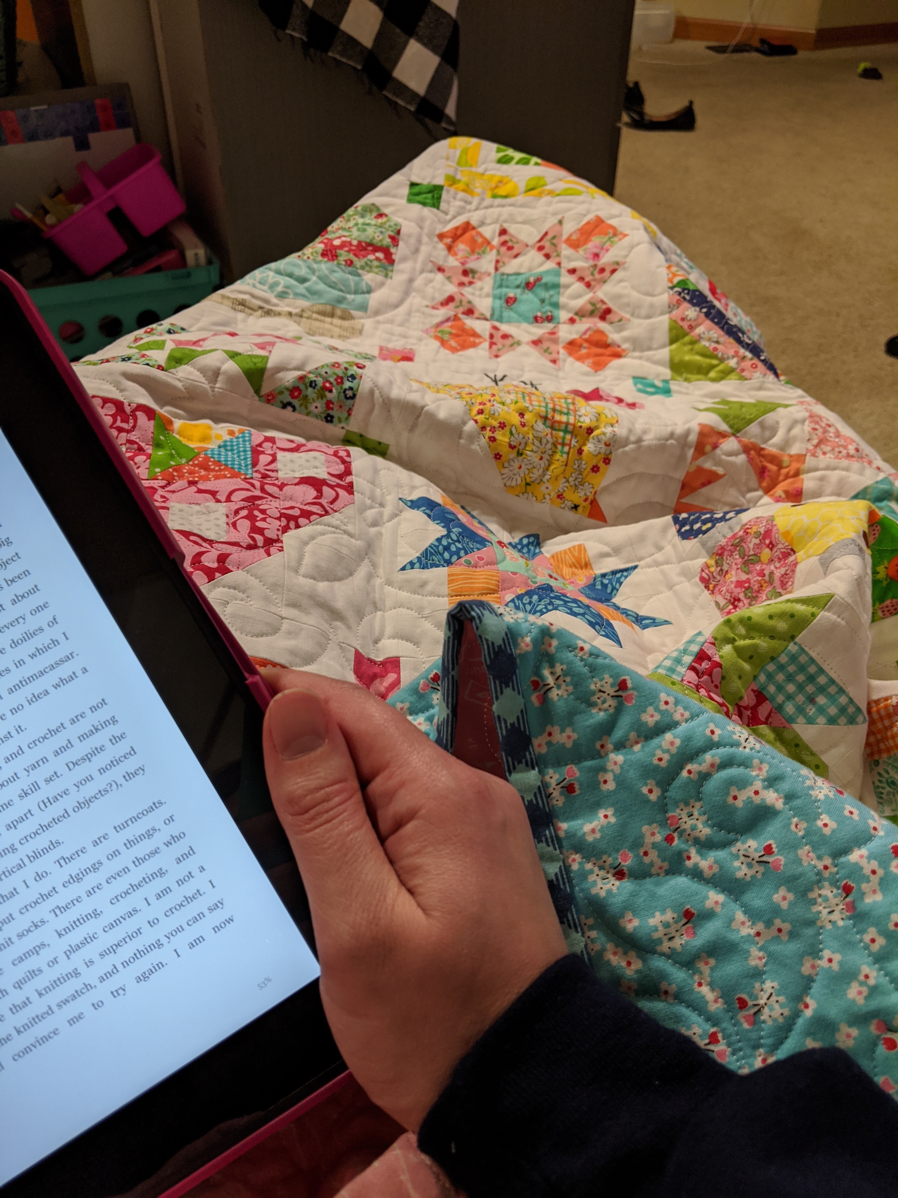 It sits on the big red chair in my craft room and I snuggle underneath it as I read or do some hand sewing. I’ve banned everyone in this house from ever using it on their beds because this quilt is MINE. I cut my baby quilter teeth on this quilt. I will be buried with this quilt.