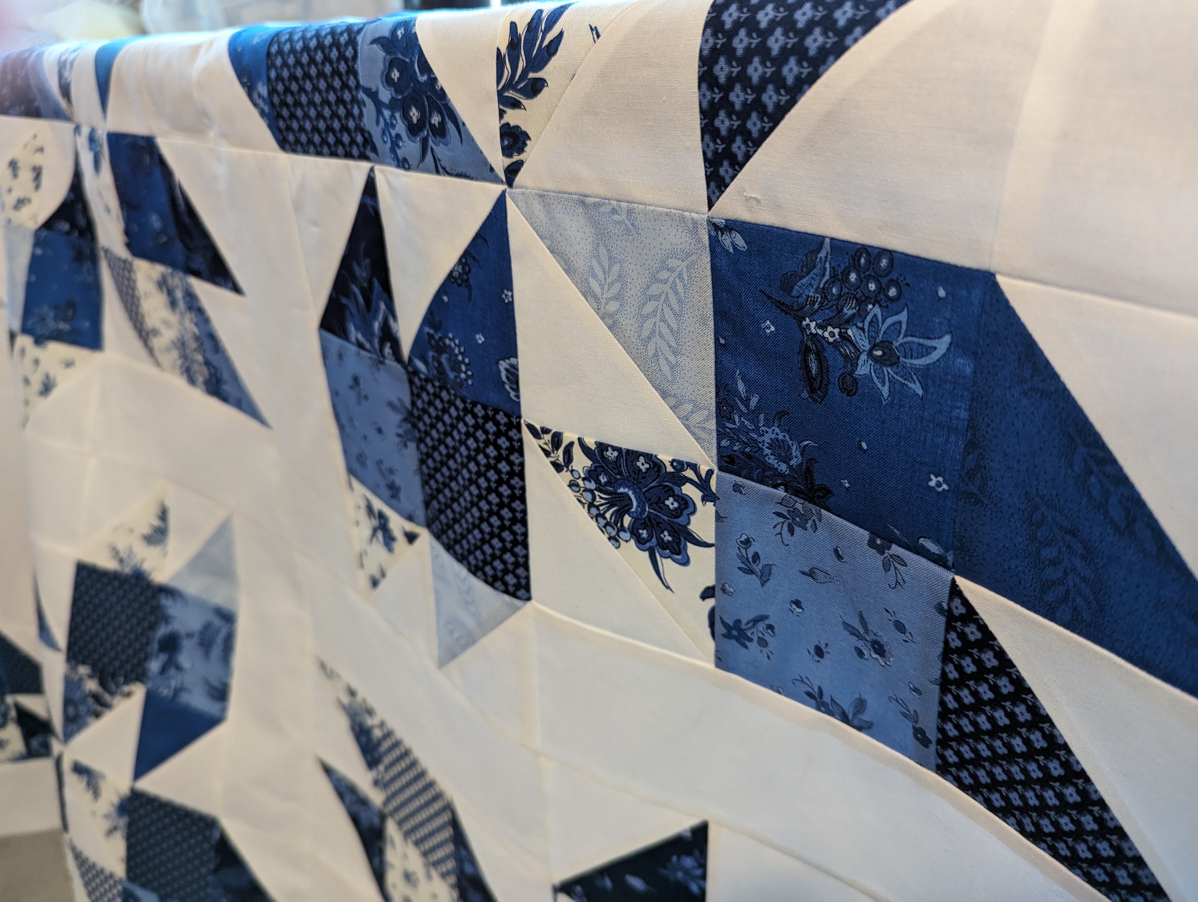 Fat Quarter Shop upcoming quilt: It’s called the “Layer Cake Latte” quilt, and it’s coming along. All the blocks are completed and I am in the midst of joining them. All that’s left is adding the skinny border around it and then the top will be done. I had hoped to get it completely quilted before the due date, but that’s not going to happen because I FORGOT ABOUT THE PROM DRESSES and need to sew like the wind on those.