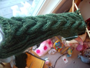 Of course, in order to knit up those two button bands, I have to cut up the front of the cardigan. But I’ve done it before on Penguin’s cardigan, so I’m not even scared of the process. (I just added the emphasis to add a little spice to your lives, dear readers.) Before I can cut the cardigan, I do need to sew some safety seams along the proposed cutting area, and that requires using my ill-tempered sewing machine, and I just didn’t have the stoutness of heart needed to embark upon any task requiring its frustratingly stubborn intent to sabotage anything I try to sew cooperation. Perhaps, as I find myself in better health as the week progresses, I will shore up the fortitude required to patiently handle that tempermental piece of crap little machine.