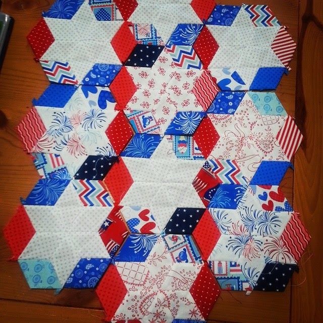 One of the nice things about all this prep is that I’m having to do a lot of waiting in random offices and other places, which grants me extra time to work on Junebug’s “Star Spangled Diamonds” quilt. I’ve completed ten full diamond units, which means I’m about 1/7 done with the piecing.