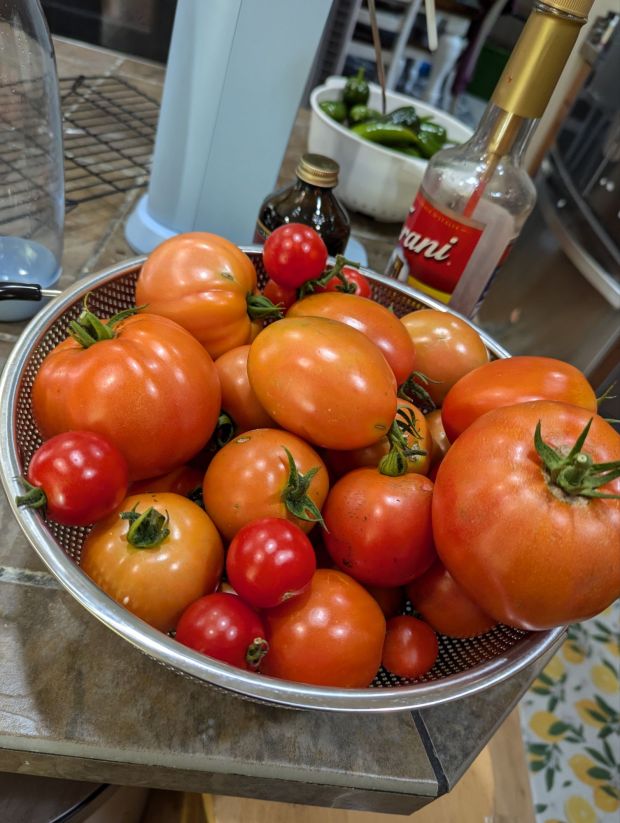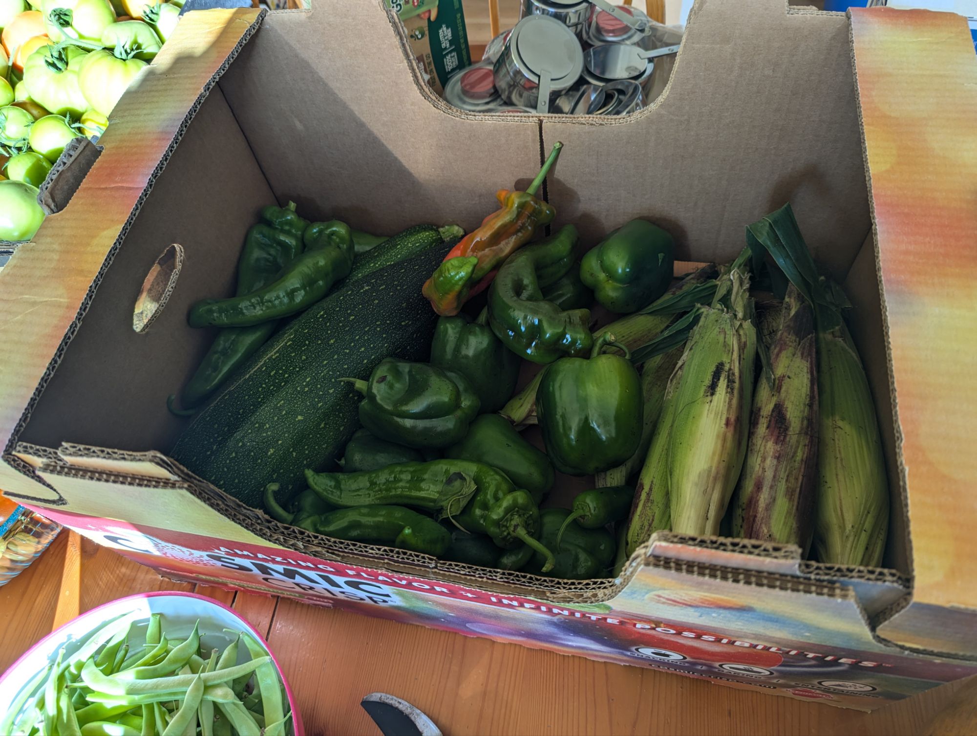 There’s not a lot that I can do in the garden, which is so beautifully overgrown and ripe that it hurts. Michael and Renaissance are doing their best to use up what we’ve got out there, for which I’m profoundly grateful. Renaissance has processed two of the pumpkins into puree and Michael has been picking my tomatoes and peppers and cramming them into everything he cooks for us these past few weeks. I grew a boatload of beautiful San Marconi peppers—they’re about ten inches long each and a vibrant red that just makes you happy to look at them. We ate the purple corn I grew and it was really good—when you cook it, the purple turns black and grey, which made for excellent Halloween-ish corn on the cob. Renaissance called up a friend who really likes making salsa and gave him four pounds of our tomatillos, which he was really jazzed about.