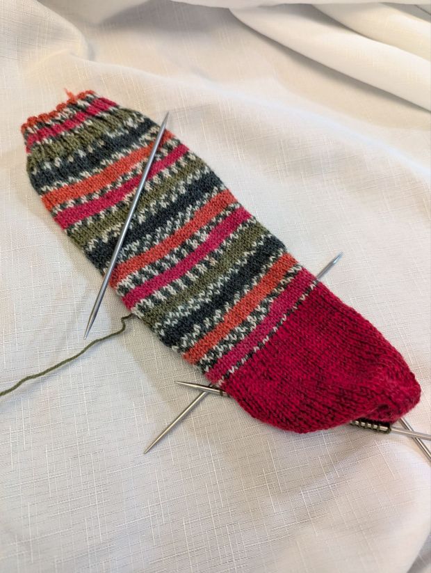 - Midnight Lark Socks: I’m not sure how I feel about these, but they’re coming along. I’m about 2/3 done with the leg of the first sock.