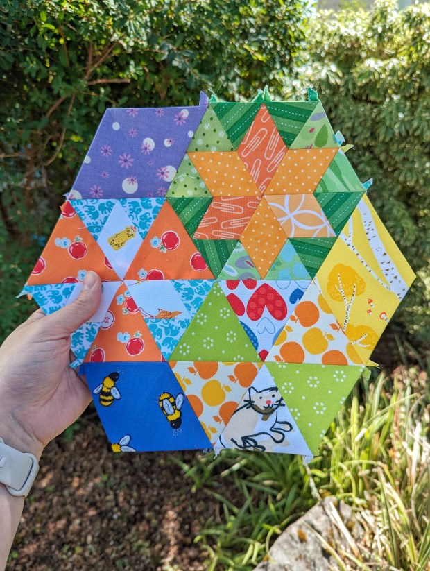 This one’s going to take a very long time. I spent some time in the past week figuring out numbers for it and I think I’m going to end up needing 50 full blossoms and 10 half blossoms, plus whatever insane number of background triangles and diamonds that I’ll math out later. As of today, I have 8 red blossoms and 7 green blossoms complete. Only 35 to go…