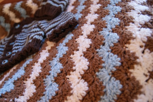 So, yeah…the era of the baby booties had ended. I was pretty OK with that because I’d made way too many of them by that point and desperately needed something else to do. I experimented with simple patchwork quilts, but the noise of the sewing machine usually woke up my sleeping baby, and the point of nap time was to have her sleep, not cry. I went back to knitting and started churning out baby hats. When I’d get bored with that, I’d switch over to crocheting baby blankets.