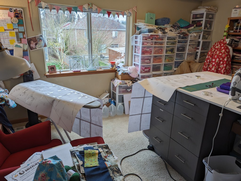 I am wary of the pattern that she’s picked out because it’s got multiple princess seams all over the place, but if I can figure it out, it’s going to be gorgeous. I’ve already spent way too much time on her pattern because it was only available via PDF download and I had to print it out onto one hundred and twenty seven pieces of paper and then tape them together. It took four hours. I complained, bitterly, on Facebook and I was amazed at how many ride-or-die friends I have who joined me in my fury over the frustration of printing out this pattern.