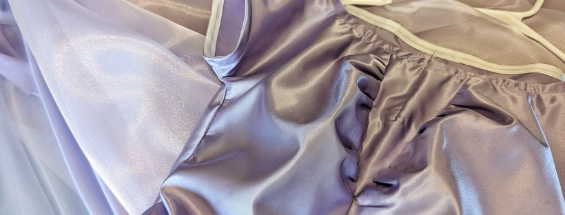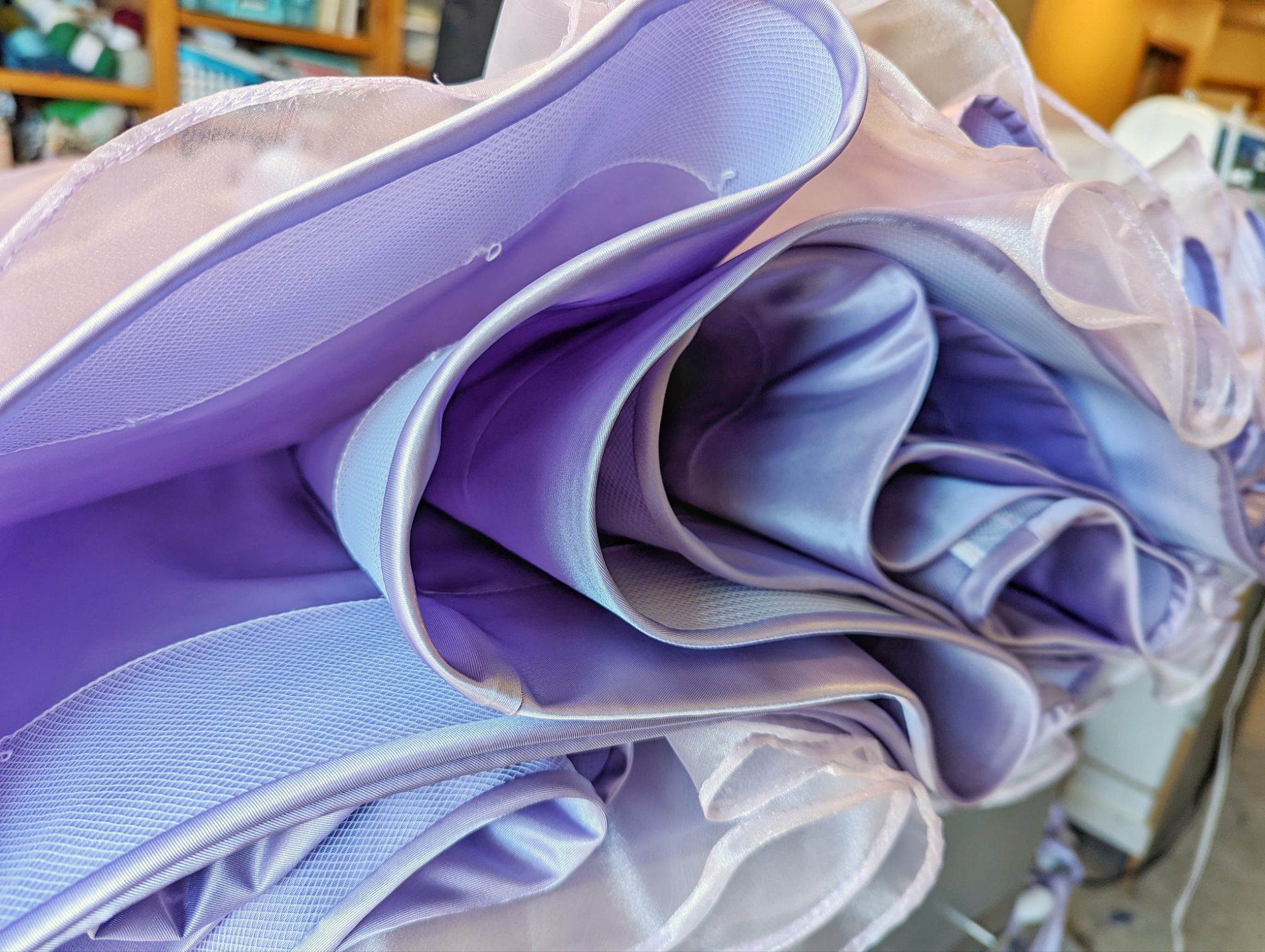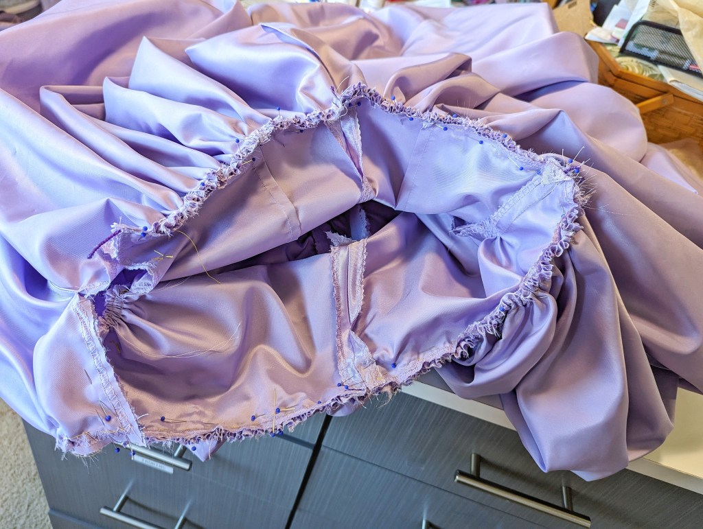 Rachel picked out a lavender satin taffeta and a lilac organza from JoAnn Fabric. We needed 11 yards of both because the main eater of yardage in this pattern is the skirt, which is ginormous AND cut double. The pattern doesn’t have instructions for two layers of skirt, but it’s what we wanted to do, so I overcast the waistline of them together and then treated it as one skirt.