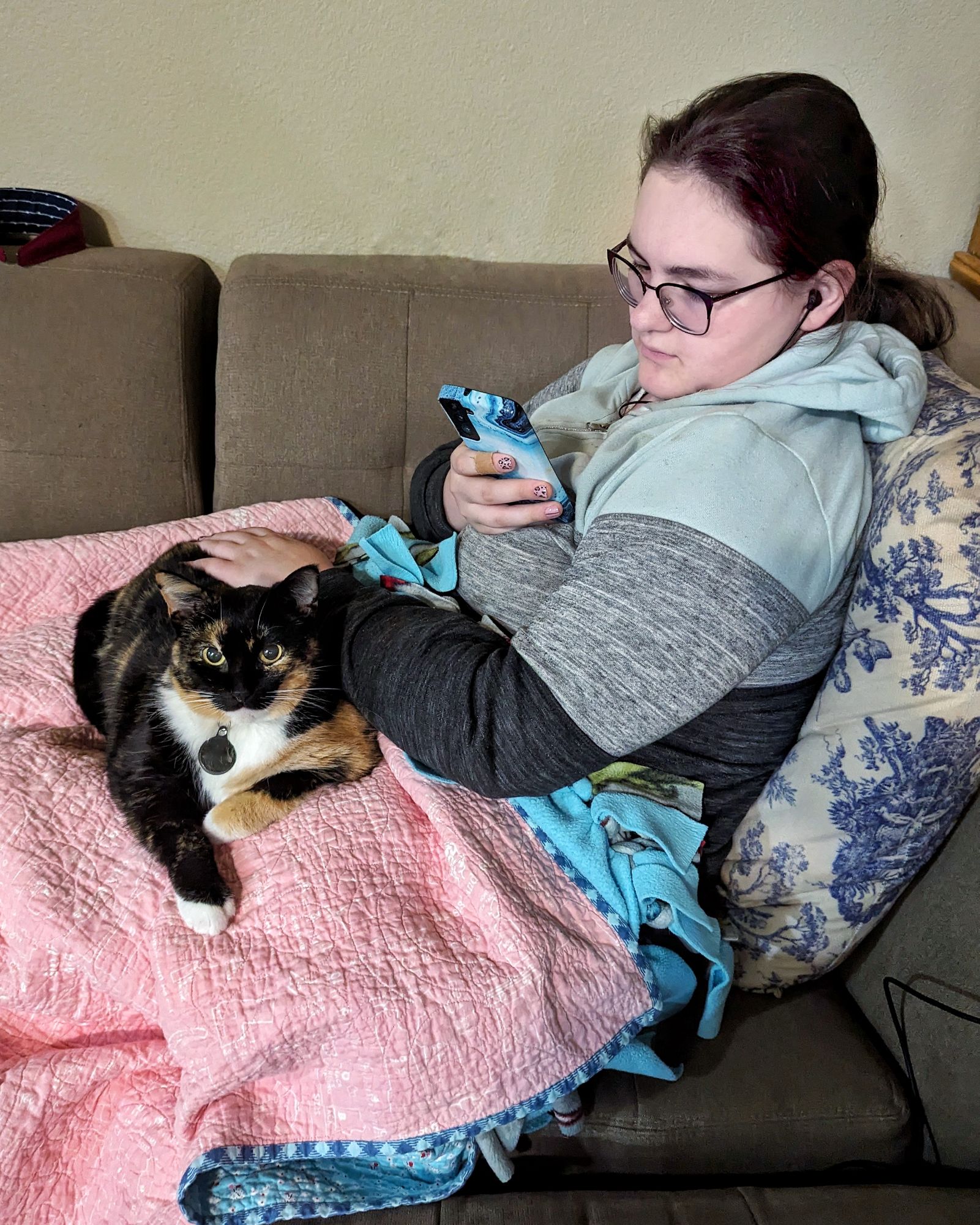 I texted Ren and told her to choose a jelly roll from Fat Quarter Shop* and was not surprised at all when she decided to go with the Here Kitty, Kitty fabric collection by Stacey Iest Hsu*. Renaissance and Quesnel have been joined at the armpit since Quesnel joined our family almost fourteen years ago, so cat fabric makes complete sense. I’m pleased that she picked out something by Stacey Iest Hsu as well, as my kids’ childhoods have had many of her fabric collections and dolls hanging around in the background. It’s a perfectly fitting choice for an end-of-childhood memory project for my girl.
