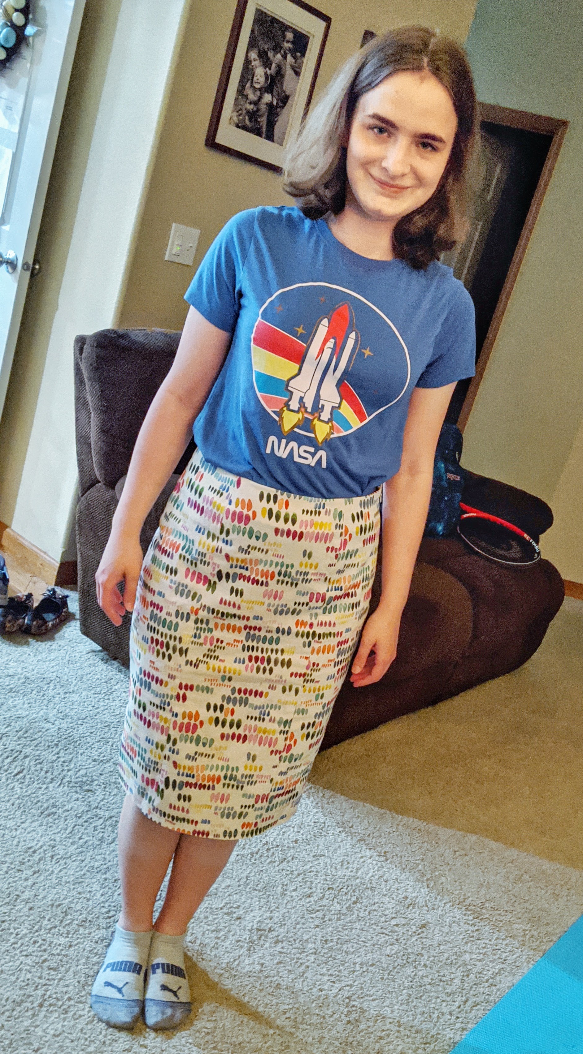 Denise and I decided to do a “Bestie Sewing Challenge,” where we both bought yardage of the same fabric and made stuff from it, just because we were bored out of our skulls with the dragging on of the pandemic and needed something to be excited about. I made myself a skirt from McCall’s 1369.